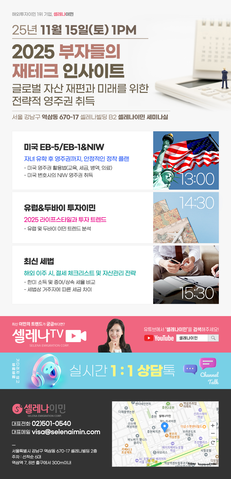 (주)셀레나이민(이하 "회사"라 함)는 이용자들의 개인정보보호를 매우 중요시하며, 이용자가 회사의 서비스 모든 국가 투자이민 (이하 "서비스" 라 함)을 이용함과 동시에 온라인상에서 회사에 제공한 개인정보가 보호 받을 수 있도록 최선을 다하고 있습니다. 이에 회사는 통신비밀보호법, 전기통신사업법, 정보통신망이용촉진등에 관한 법률 등 정보통신서비스제공자가 준수하여야 할 관련 법규상의 개인정보보호 규정 및 정보통신부가 제정한 개인정보보호지침을 준수하고 있습니다. 회사는 개인정보 보호정책을 통하여 이용자들이 제공하는 개인정보가 어떠한 용도와 방식으로 이용되고 있으며 개인정보보호를 위해 어떠한 조치가 취해지고 있는지 알려드립니다.
