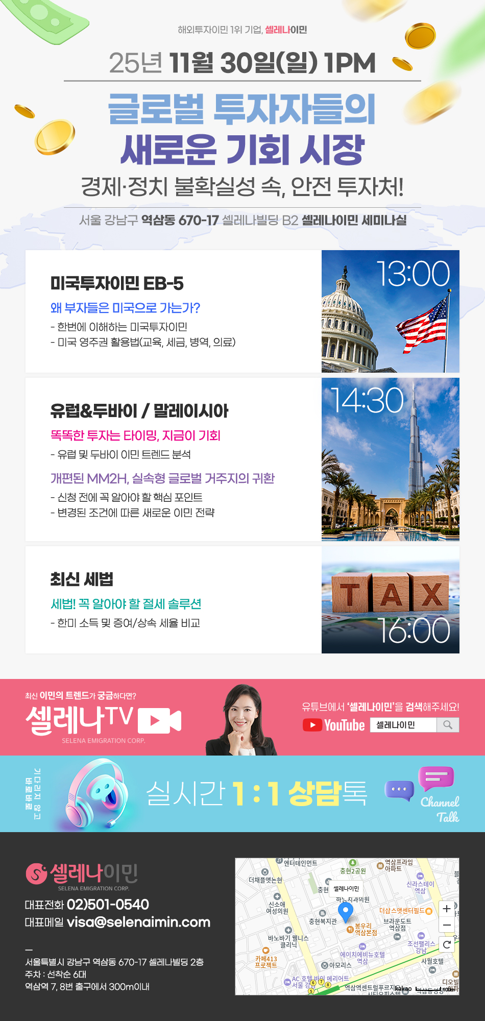 (주)셀레나이민(이하 "회사"라 함)는 이용자들의 개인정보보호를 매우 중요시하며, 이용자가 회사의 서비스 모든 국가 투자이민 (이하 "서비스" 라 함)을 이용함과 동시에 온라인상에서 회사에 제공한 개인정보가 보호 받을 수 있도록 최선을 다하고 있습니다. 이에 회사는 통신비밀보호법, 전기통신사업법, 정보통신망이용촉진등에 관한 법률 등 정보통신서비스제공자가 준수하여야 할 관련 법규상의 개인정보보호 규정 및 정보통신부가 제정한 개인정보보호지침을 준수하고 있습니다. 회사는 개인정보 보호정책을 통하여 이용자들이 제공하는 개인정보가 어떠한 용도와 방식으로 이용되고 있으며 개인정보보호를 위해 어떠한 조치가 취해지고 있는지 알려드립니다.